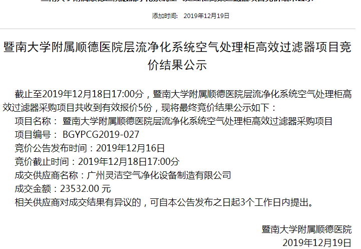 靈潔為暨南大學(xué)附屬順德醫(yī)院層流凈化系統(tǒng)高效過濾器項(xiàng)目順利完工