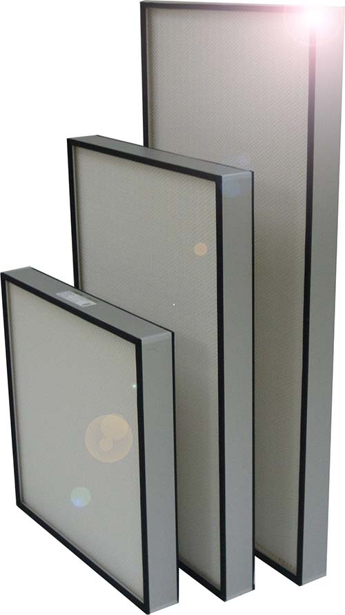 產(chǎn)品特性: * 無隔板高效過濾器主要用于過濾0.3um以下的空氣懸浮顆粒,作為各種過濾系統(tǒng)的末端過濾; * 采用超細(xì)玻璃纖維濾料,熱溶膠為分隔物,專用鋁型材外框,聚氨酯雙組份密封