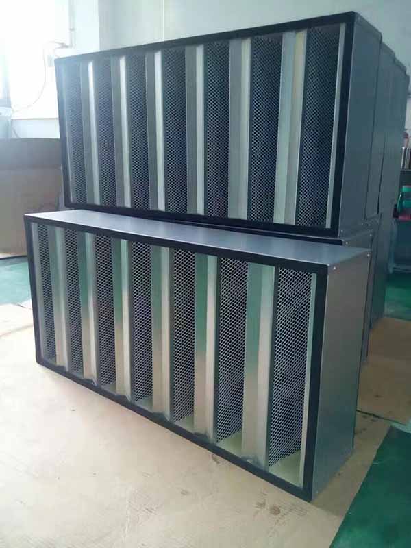 組合式活性炭過濾器也叫V型活性碳過濾器,主要采用的顆粒狀活性炭,如椰殼活性炭、柱狀活性炭等,均勻灌注并封存在特定的蜂窩狀基材內(nèi),四周可采用紙邊框、鋁合金邊框或不銹鋼邊框等;具有活性炭含量高,吸附能力強、使用壽命長等特點。