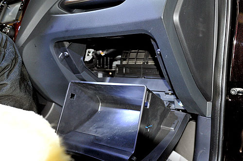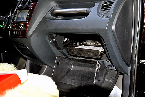 卸下儲(chǔ)物盒,可看到空調(diào)濾芯